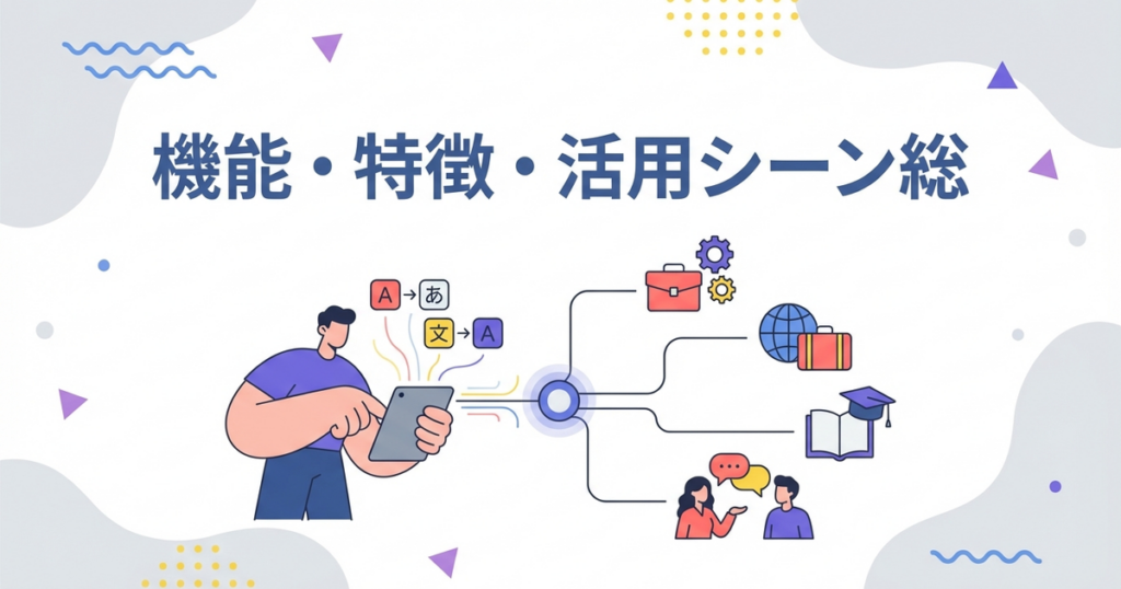 じたん翻訳の機能・特徴・活用シーンを総まとめで紹介します。どのような使い方ができるか、一覧で確認できます。